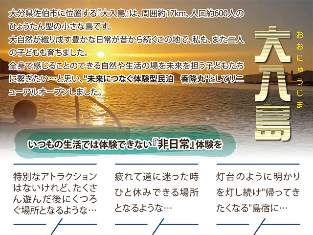 大分県佐伯市に位置する『大入島』は、周囲約17km、人口約600人のひょうたん型の小さな島です。大自然が織り成す豊かな日常が昔から続くこの地で、私も、また二人の子どもも育ちました。